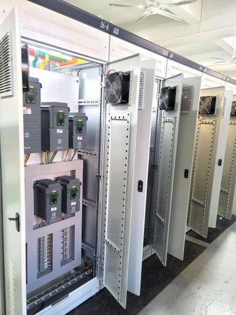 The GGD cabinet shown uses a hybrid VFD layout, integrating multiple Schneider and ABB drives to support different cooling stages, ensuring real-time load adaptation and energy savings. The drives are mounted in front-access compartments with built-in ventilation panels and safety covers.